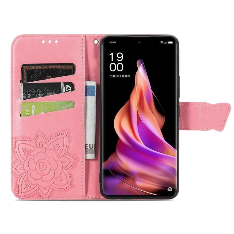Θήκη τηλεφώνου από δέρμα με ανάγλυφο σχέδιο πεταλούδας και λουλουδιών για OPPO Reno9 Pro+ (Ροζ)