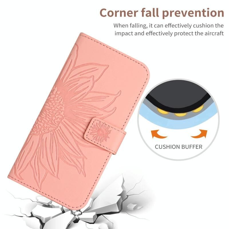 Για OPPO Reno9 Pro + HT04 δέρμα αίσθηση Sun Flower ανάγλυφο ανάγλυφο Flip δέρμα τηλέφωνο υπόθεση με κορδόνι (ροζ)