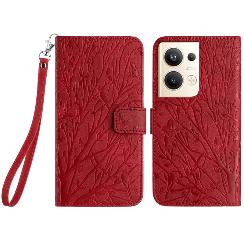 For OPPO Reno9 Pro+ Tree Birds Embossed Pattern Leather Phone Case(Red)