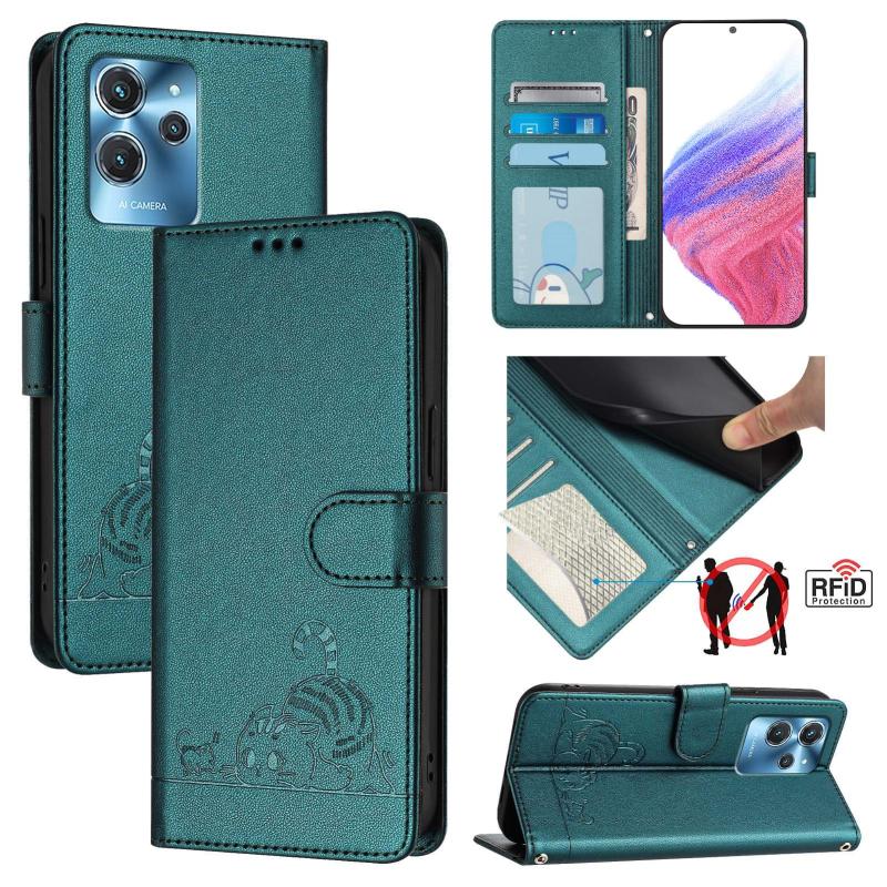 For Oukitel C32 Cat Rat Embossed Pattern RFID Leather Phone Case with Lanyard(Peacock Green)