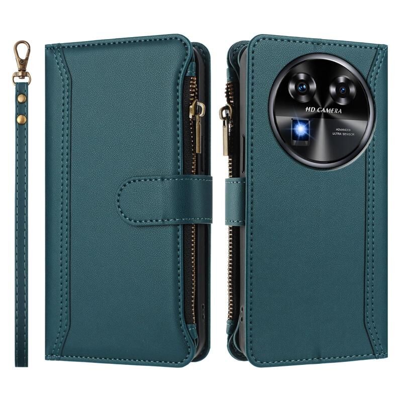 For Oukitel C37 Magnetic Closure 9 Card Slots Zipper Leather Case with Hand Strap(Dark Green)