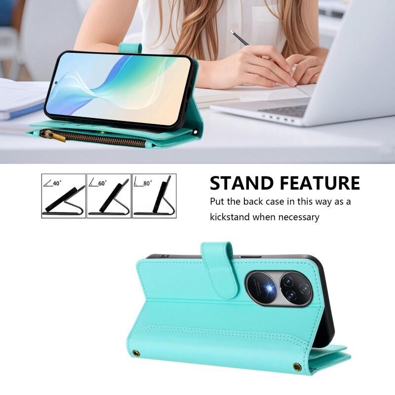For Oukitel C38 Magnetic Closure 9 Card Slots Zipper Leather Case with Hand Strap(Mint Green)