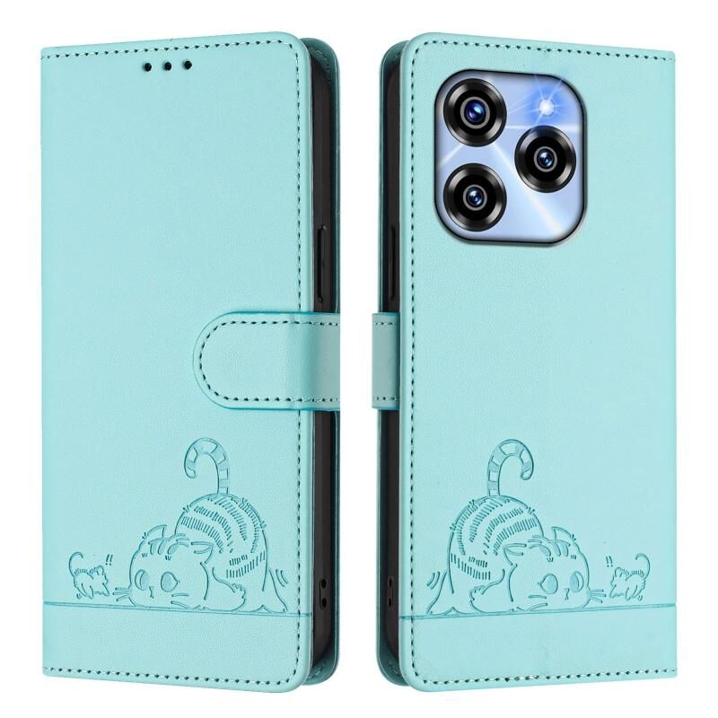For Oukitel C50 Cat Rat Embossed Pattern RFID Leather Phone Case with Lanyard(Mint Green)