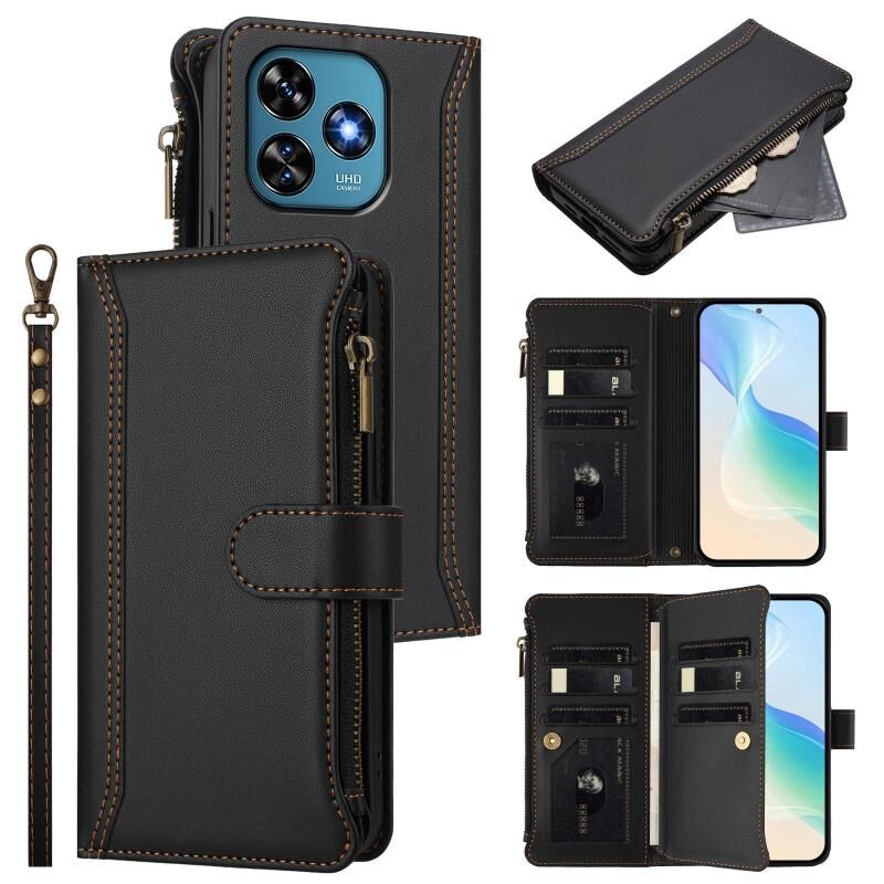 For Oukitel C51 Magnetic Closure 9 Card Slots Zipper Leather Case with Hand Strap(Black)