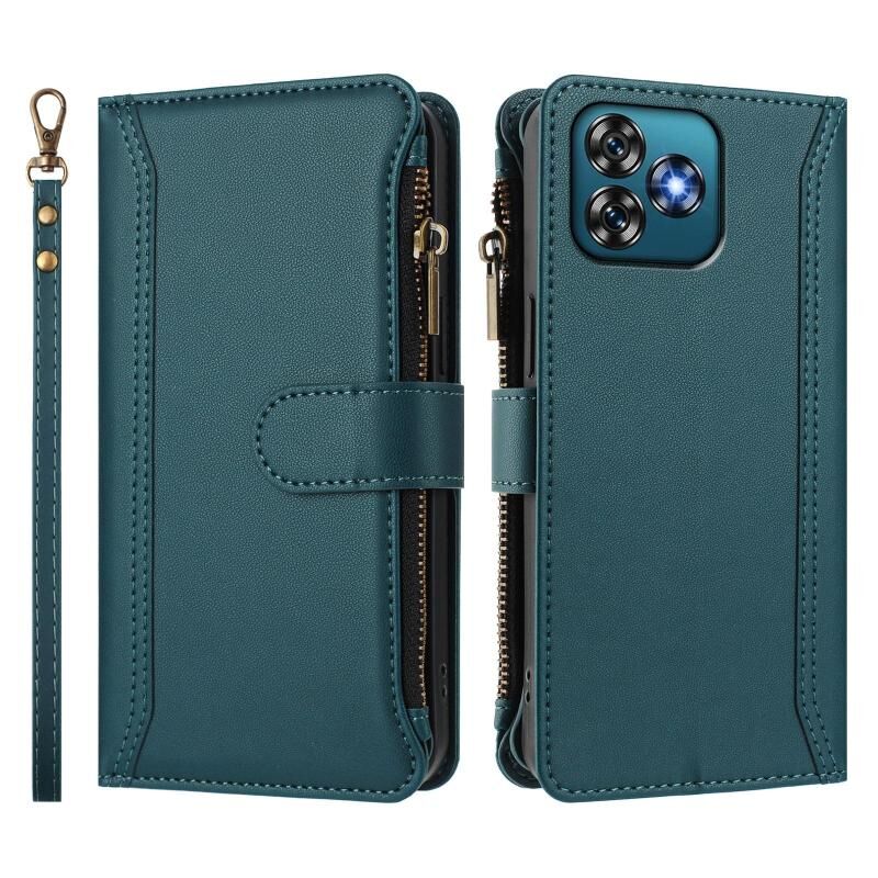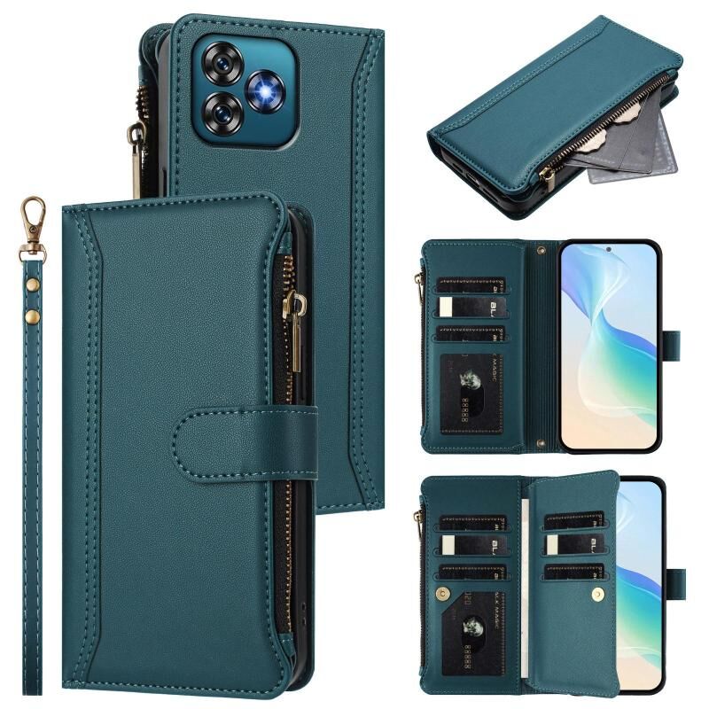 For Oukitel C53 Magnetic Closure 9 Card Slots Zipper Leather Case with Hand Strap(Dark Green)