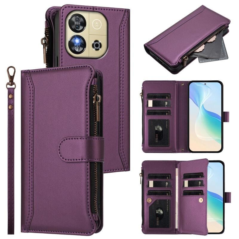 For Oukitel C57s / C57 Pro / C57 Magnetic Closure 9 Card Slots Zipper Leather Case with Hand Strap(Purple)