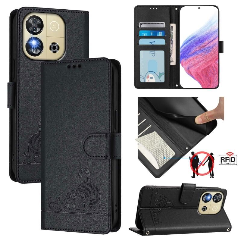 For Oukitel C57s Cat Rat Embossed Pattern RFID Leather Phone Case with Lanyard(Black)