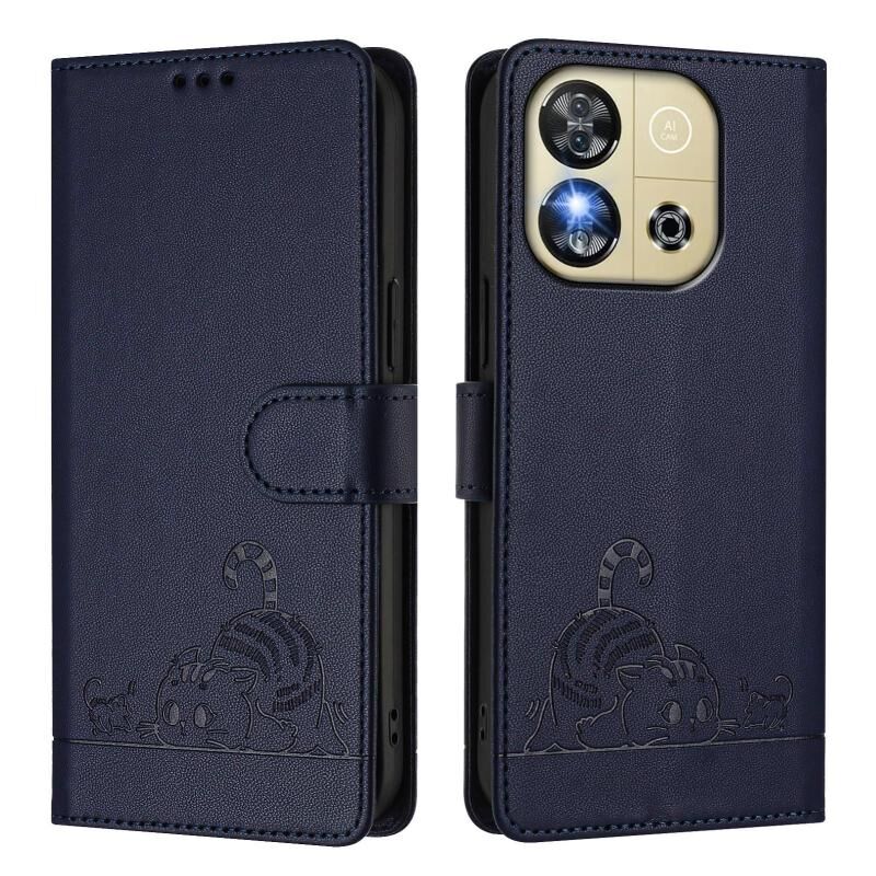 For Oukitel C57s Cat Rat Embossed Pattern RFID Leather Phone Case with Lanyard(Blue)