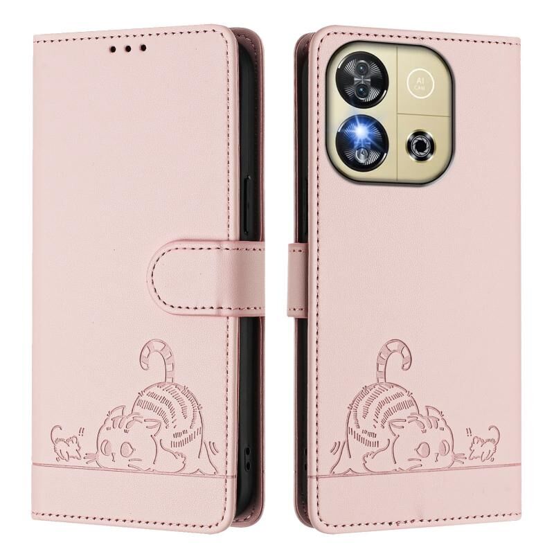 For Oukitel C57s Cat Rat Embossed Pattern RFID Leather Phone Case with Lanyard(Pink)