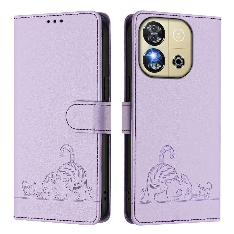 For Oukitel C57s Cat Rat Embossed Pattern RFID Leather Phone Case with Lanyard(Purple)
