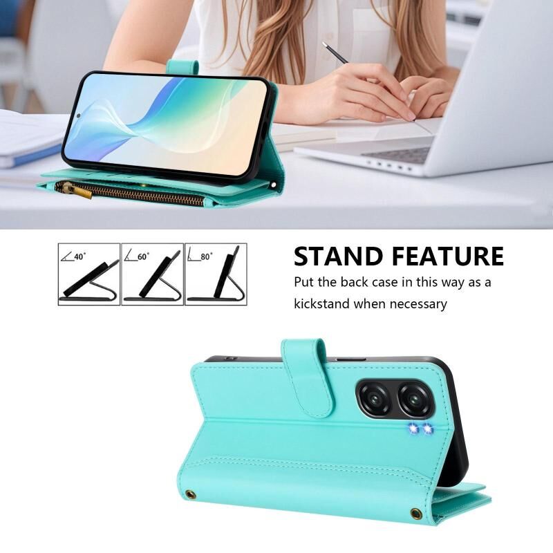 For Oukitel C58 / C58 Pro Magnetic Closure 9 Card Slots Zipper Leather Case with Hand Strap(Mint Green)
