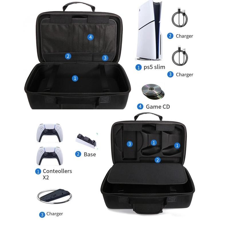 4. Large capacity design, can hold game console, charging accessories, game CD x 8, controller x 2, charging base, etc.