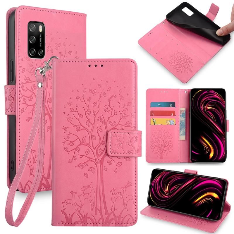 Για Rakuten Big S δέντρο & ελάφι ανάγλυφη δερμάτινη θήκη τηλεφώνου (ροζ)
