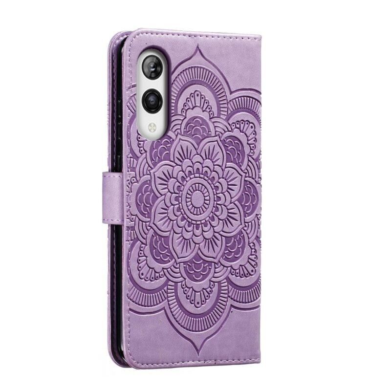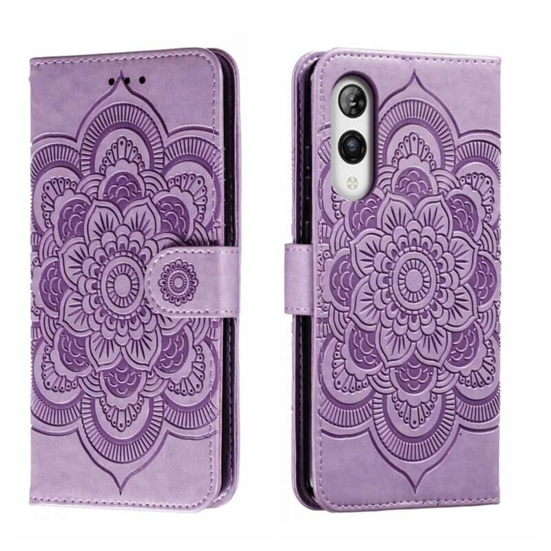 Για Rakuten Hand 5G Sun Mandala ανάγλυφο μοτίβο τηλέφωνο δερμάτινη θήκη (μωβ)