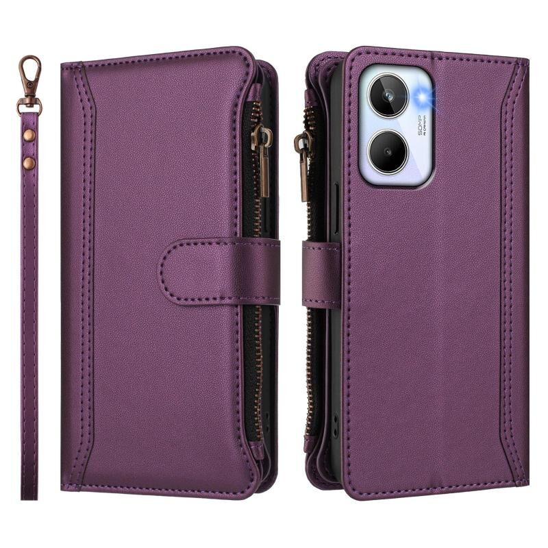 For Realme 10 4G Global Magnetic Closure 9 Card Slots Zipper Leather Case with Hand Strap(Purple)