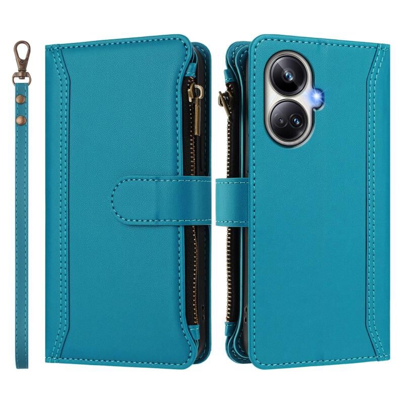 For Realme 10 Pro+ 5G Magnetic Closure 9 Card Slots Zipper Leather Case with Hand Strap(Turquoise)