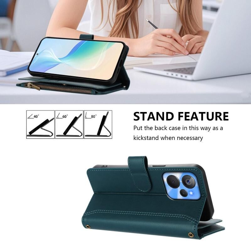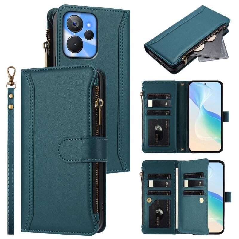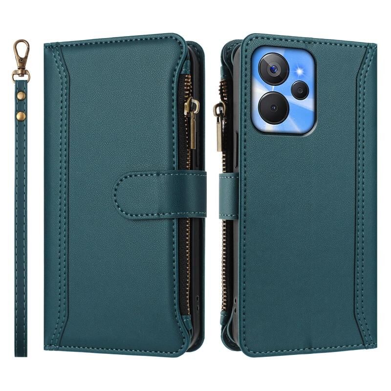 For Realme 10T 5G / 10S 5G Magnetic Closure 9 Card Slots Zipper Leather Case with Hand Strap(Dark Green)