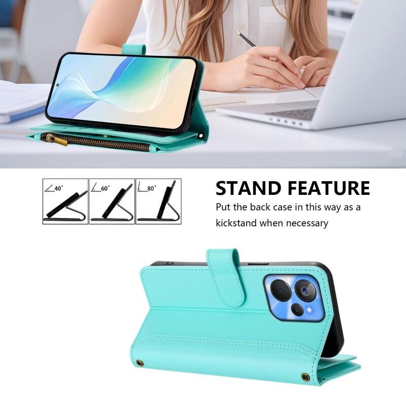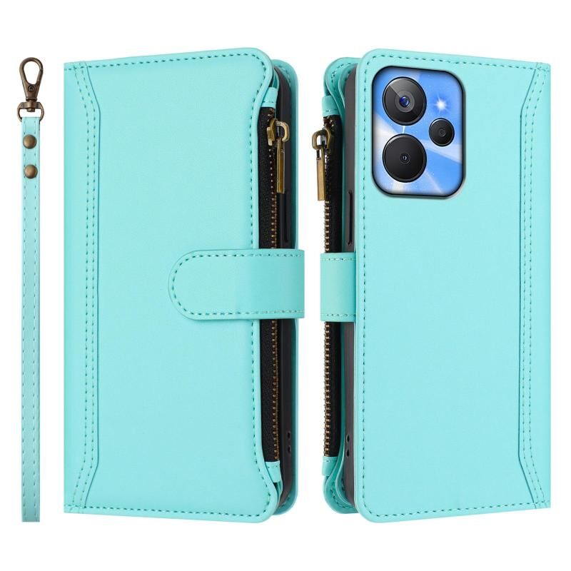 For Realme 10T 5G / 10S 5G Magnetic Closure 9 Card Slots Zipper Leather Case with Hand Strap(Mint Green)