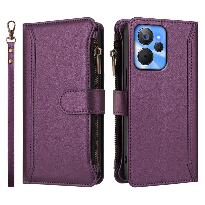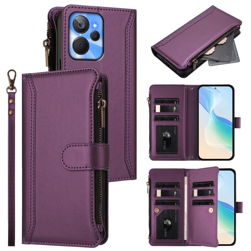 For Realme 10T 5G / 10S 5G Magnetic Closure 9 Card Slots Zipper Leather Case with Hand Strap(Purple)