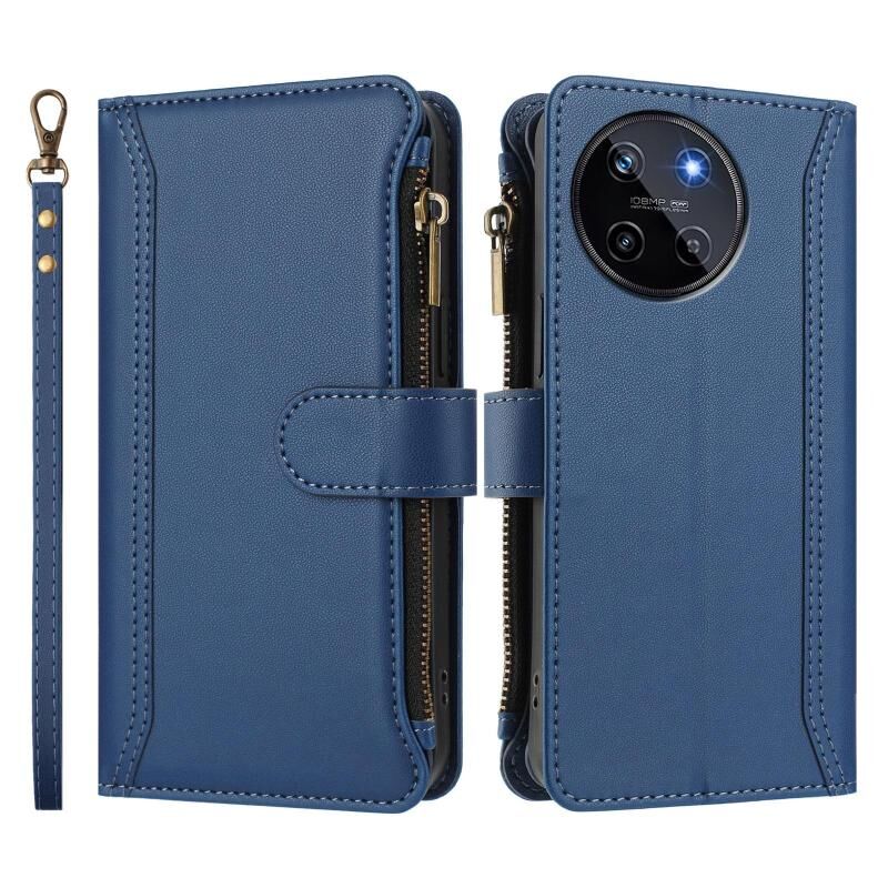 For Realme 11 4G Global Magnetic Closure 9 Card Slots Zipper Leather Case with Hand Strap(Dark Blue)