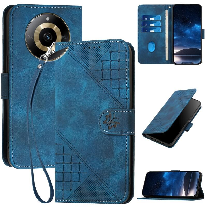 For Realme 11 5G Global Grid Butterfly Embossed Pattern Leather Phone Case with Lanyard(Dark Blue)