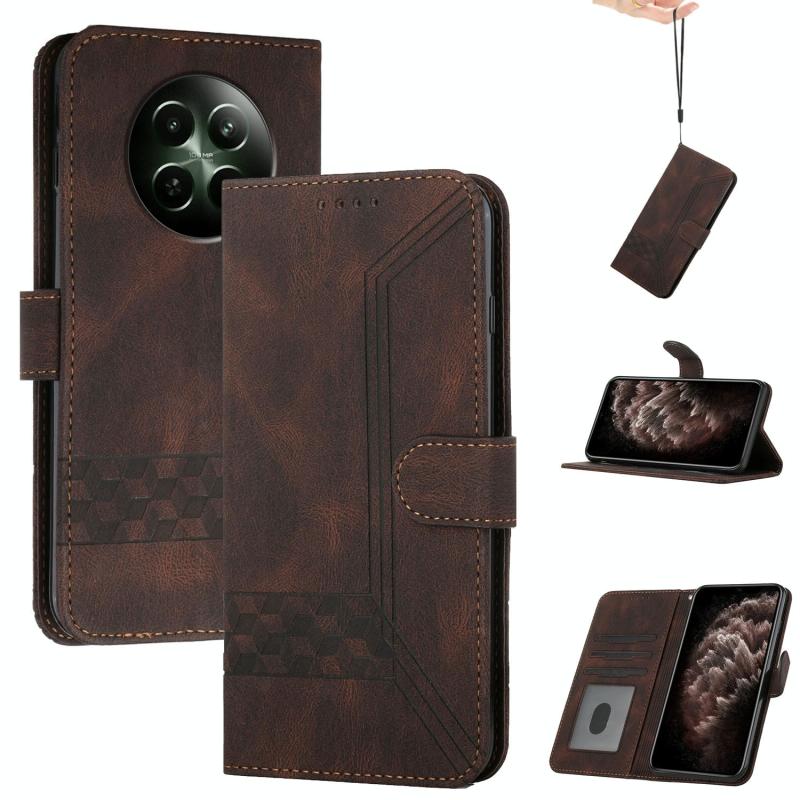 For Realme 12 5G Global Cubic Skin Feel Flip Leather Phone Case(Brown)