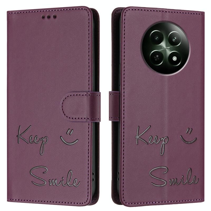 Για Realme 12 5G Παγκόσμια χαμόγελο ανάγλυφο RFID δερμάτινη θήκη τηλεφώνου (Violet)