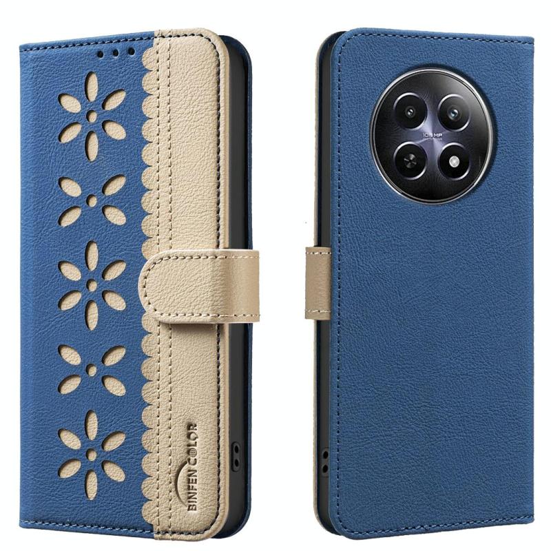 For Realme 12 5G Global Splicing Color Hollow Flower Pattern RFID Leather Phone Case(Dark Blue)