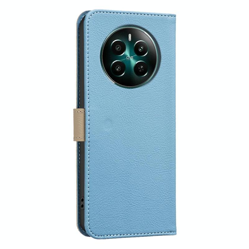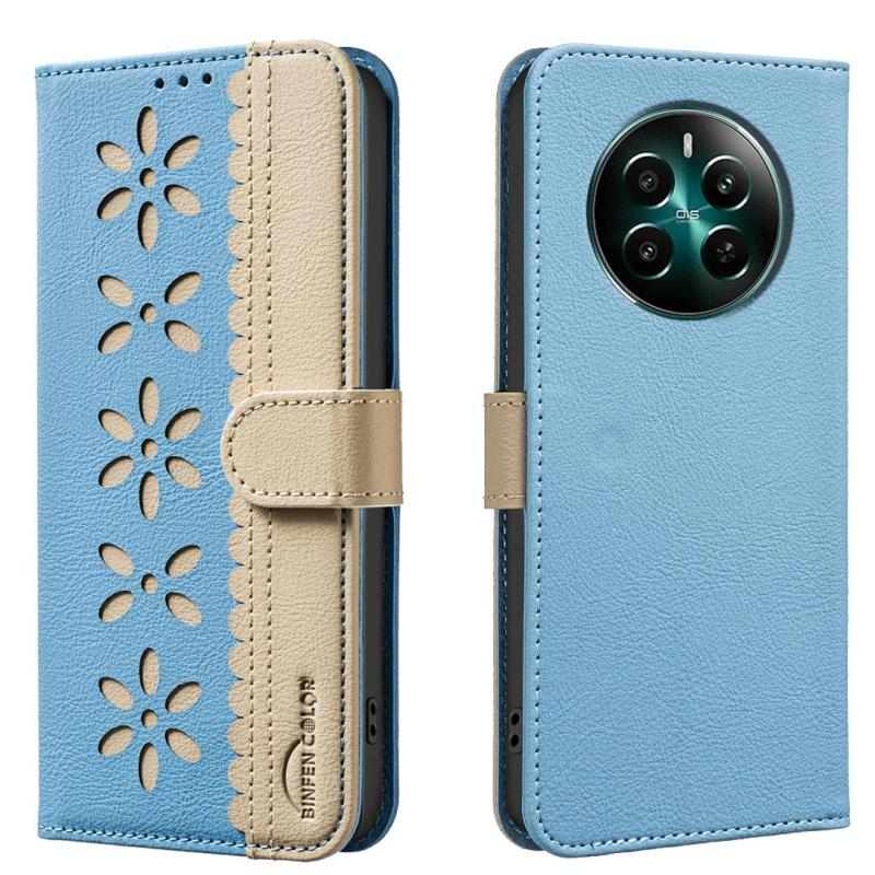 For Realme 12+ 5G Splicing Color Hollow Flower Pattern RFID Leather Phone Case(Baby Blue)