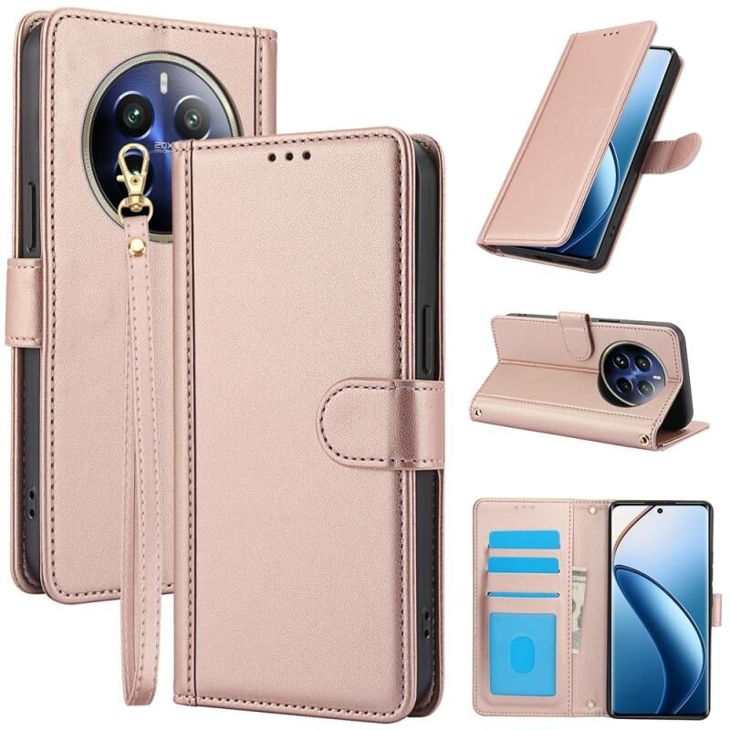 Για Realme 12 Pro / 12 Pro + Skin Feel Pure Color Card Slots δερμάτινη θήκη τηλεφώνου με διπλό κορδόνι (Rose Gold)