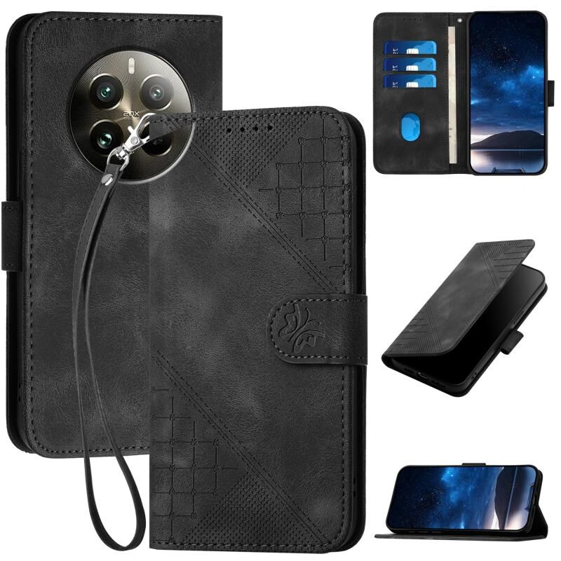Θήκη τηλεφώνου δερμάτινη με ανάγλυφο σχέδιο πεταλούδας και πλέγμα για Realme 12 Pro+ 5G Global με κορδόνι (Μαύρο)