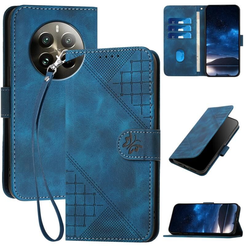 For Realme 12 Pro+ 5G Global Grid Butterfly Embossed Pattern Leather Phone Case with Lanyard(Dark Blue)