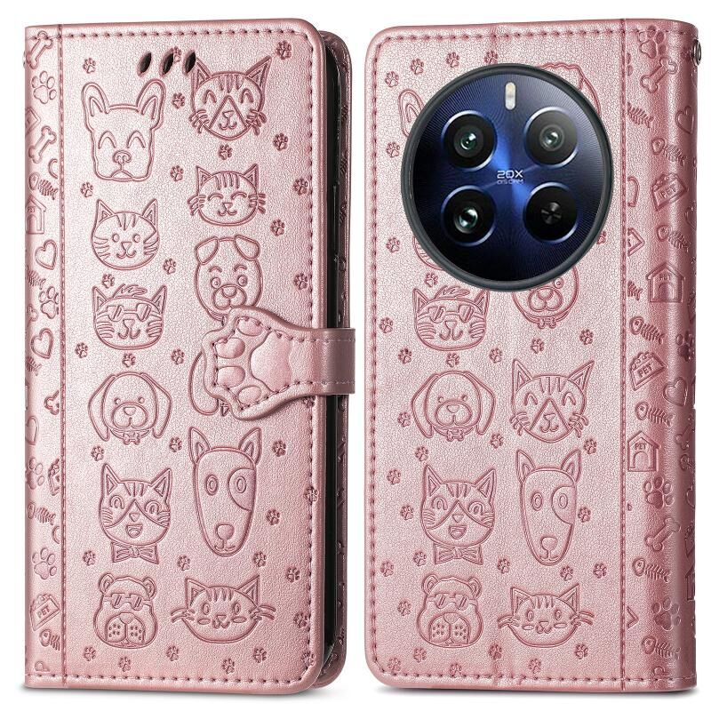 Θήκη τηλεφώνου από δέρμα με ανάγλυφο σχέδιο γάτας και σκύλου για Realme 12 Pro (Χρυσορόδινο)