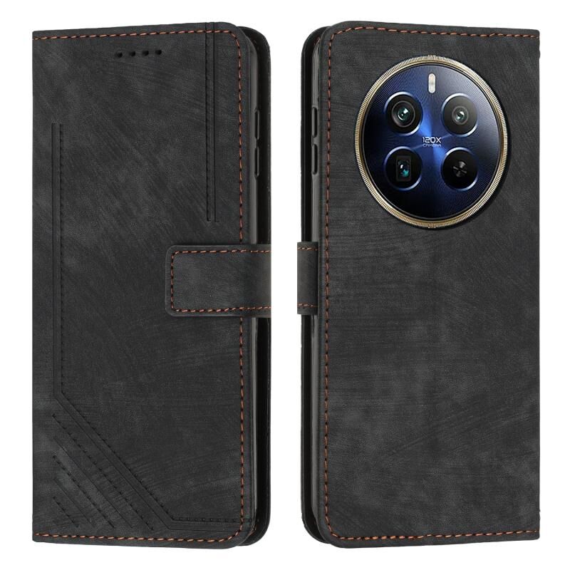 For Realme 12 Pro+ Skin Feel Stripe Pattern Leather Phone Case with Lanyard(Black)