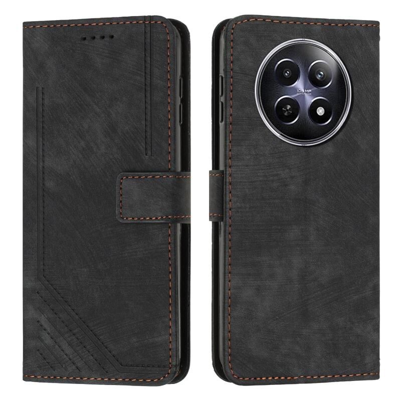 For Realme 12 Skin Feel Stripe Pattern Leather Phone Case with Lanyard(Black)