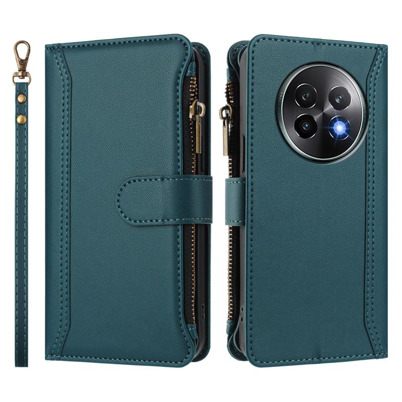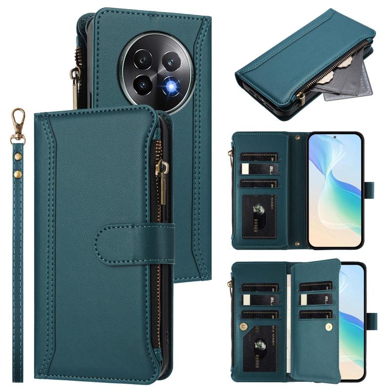 For Realme 13+ 5G Global Magnetic Closure 9 Card Slots Zipper Leather Case with Hand Strap(Dark Green)