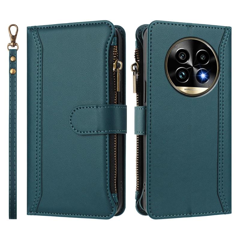 For Realme 13 Pro 5G Global Magnetic Closure 9 Card Slots Zipper Leather Case with Hand Strap(Dark Green)