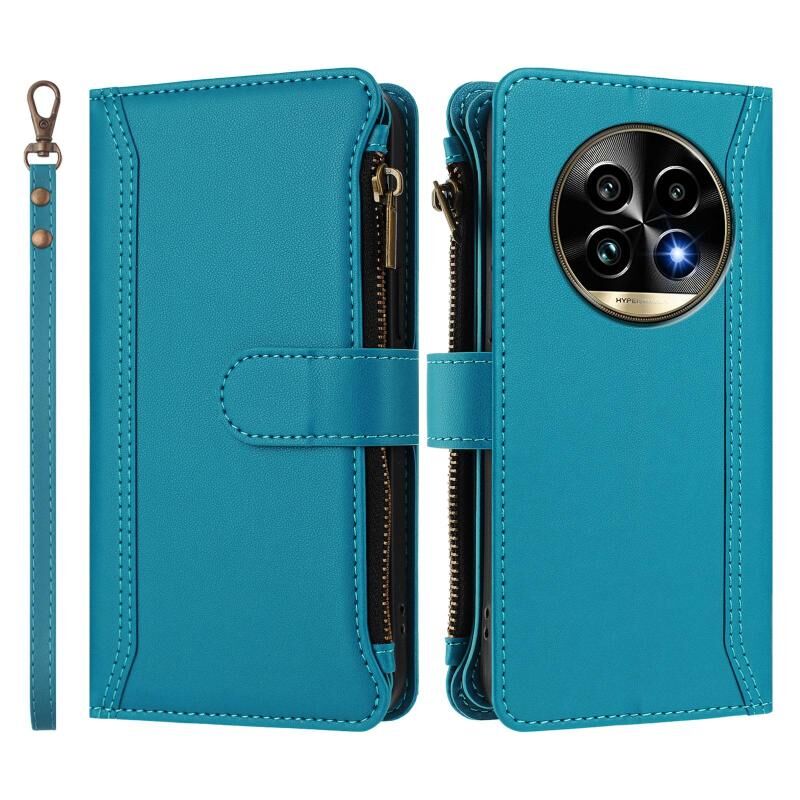 For Realme 13 Pro 5G Global Magnetic Closure 9 Card Slots Zipper Leather Case with Hand Strap(Turquoise)
