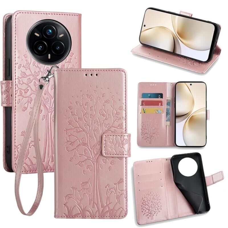 For Realme 14 Pro 5G Global Tree & Deer Embossed Leather Phone Case(Rose Gold)