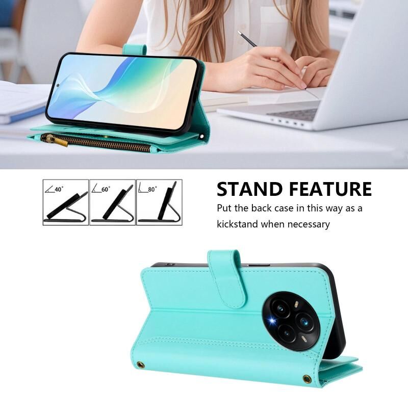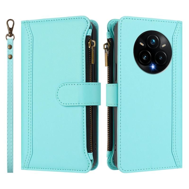 For Realme 14 Pro+ 5G Magnetic Closure 9 Card Slots Zipper Leather Case with Hand Strap(Mint Green)