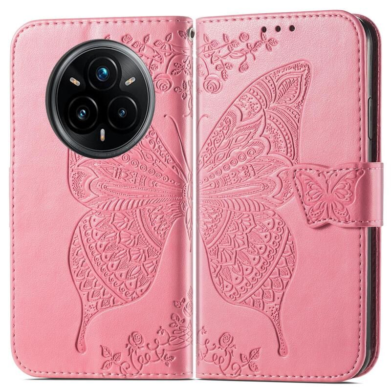 Θήκη τηλεφώνου από δέρμα με ανάγλυφο σχέδιο πεταλούδας και λουλουδιών για Realme 14 Pro+ (Χρυσό Ροζ)