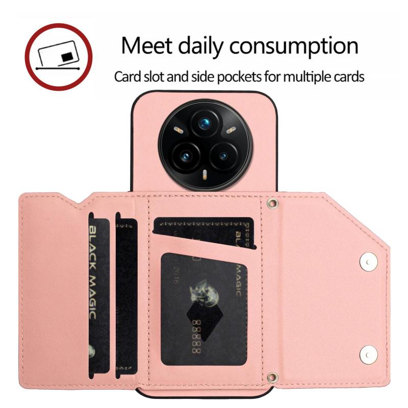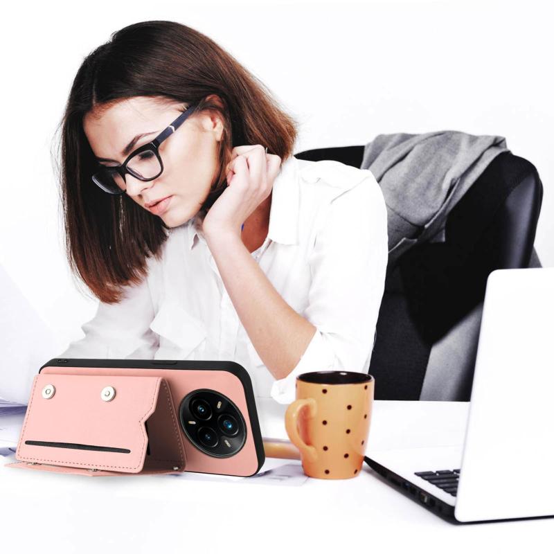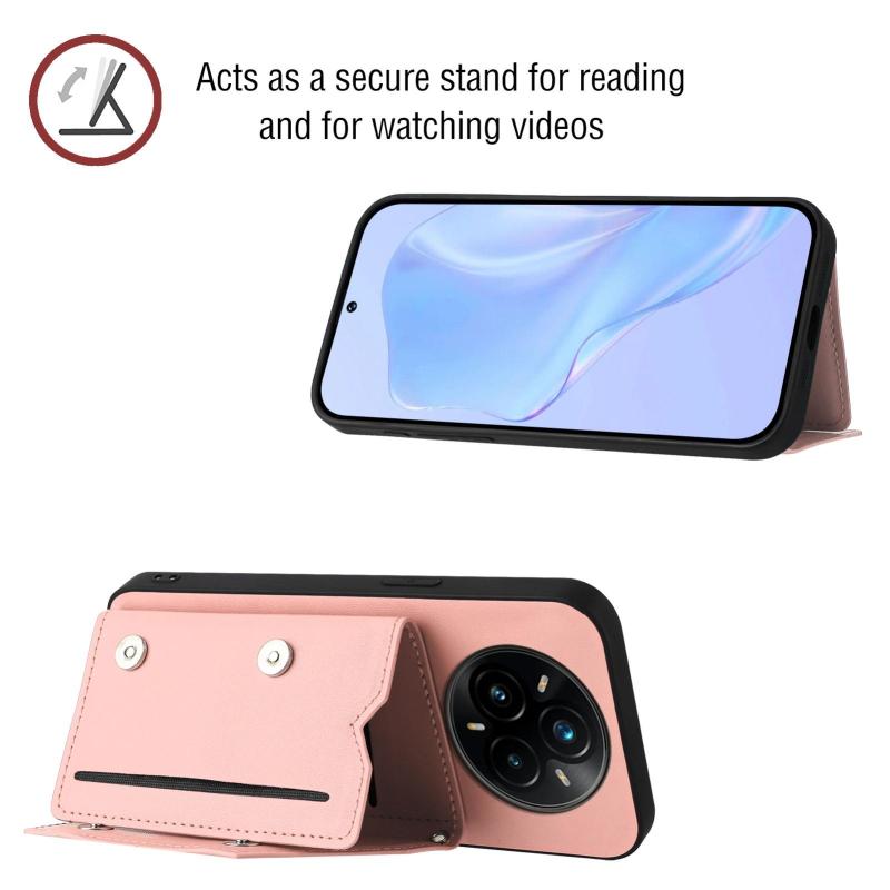 For Realme 14 Pro+ Skin Feel Four Card Slots Phone Case with Wrist Strap(Pink)