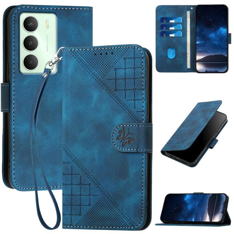 For Realme 14x Global Grid Butterfly Embossed Pattern Leather Phone Case with Lanyard(Dark Blue)