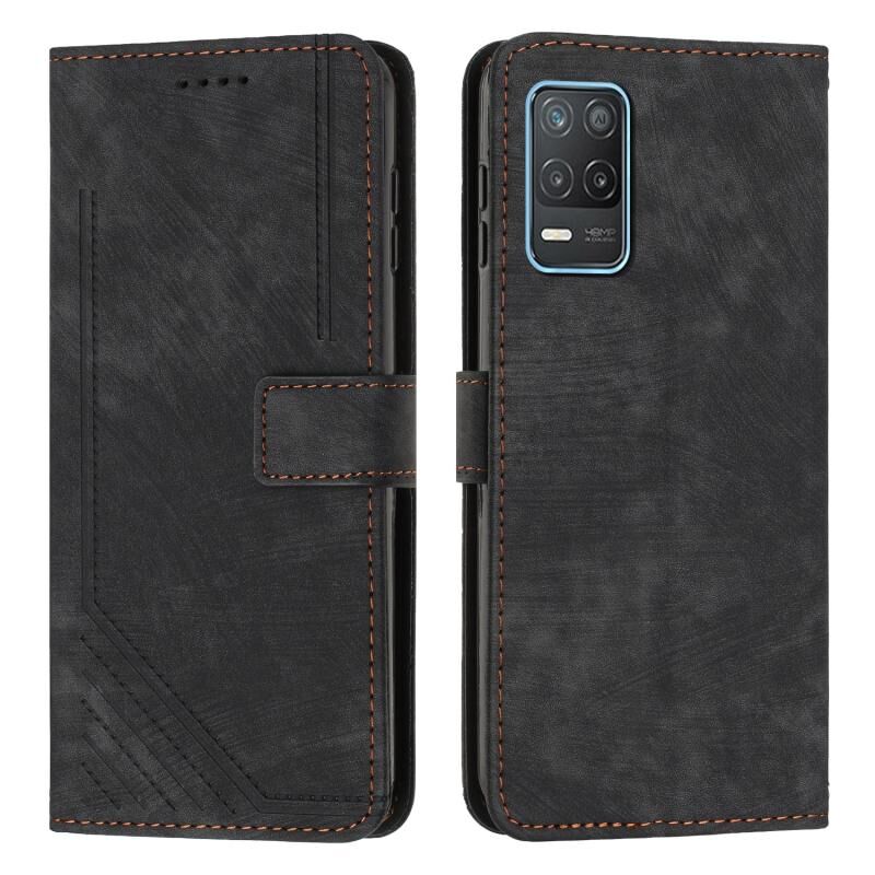 Για Realme 8 5G / V13 5G Skin Feel Stripe Pattern Δερμάτινη θήκη τηλεφώνου με κορδόνι (Μαύρο)