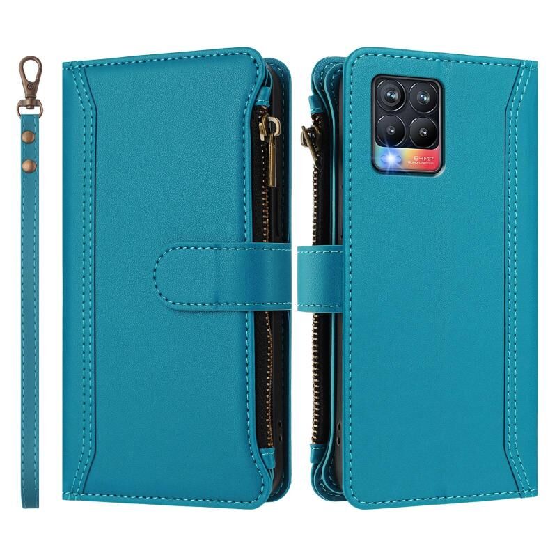 For Realme 8 / 8 Pro Magnetic Closure 9 Card Slots Zipper Leather Case with Hand Strap(Turquoise)