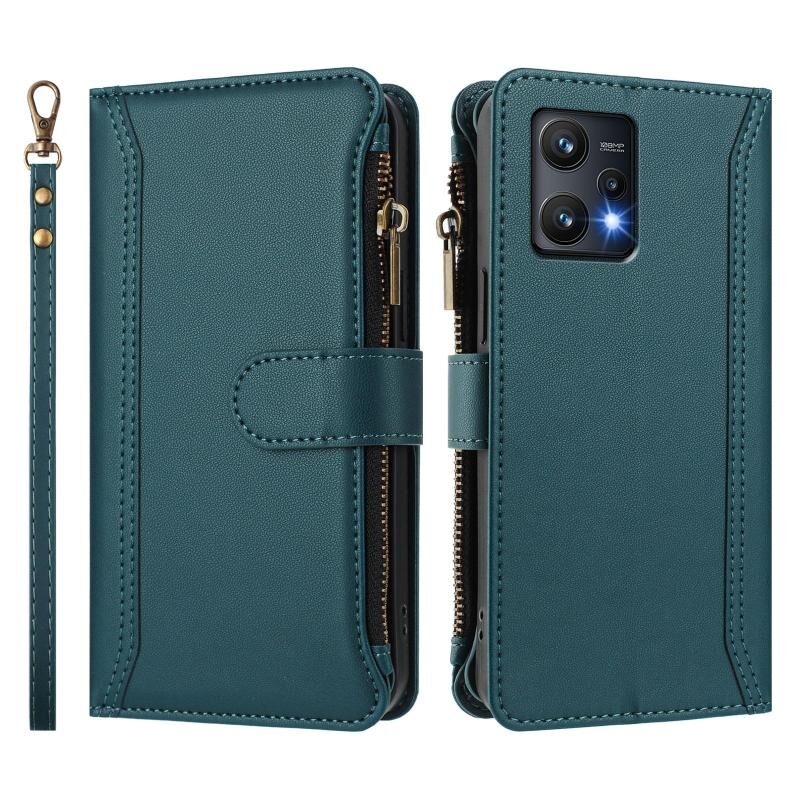 For Realme 9 Pro 5G Global Magnetic Closure 9 Card Slots Zipper Leather Case with Hand Strap(Dark Green)