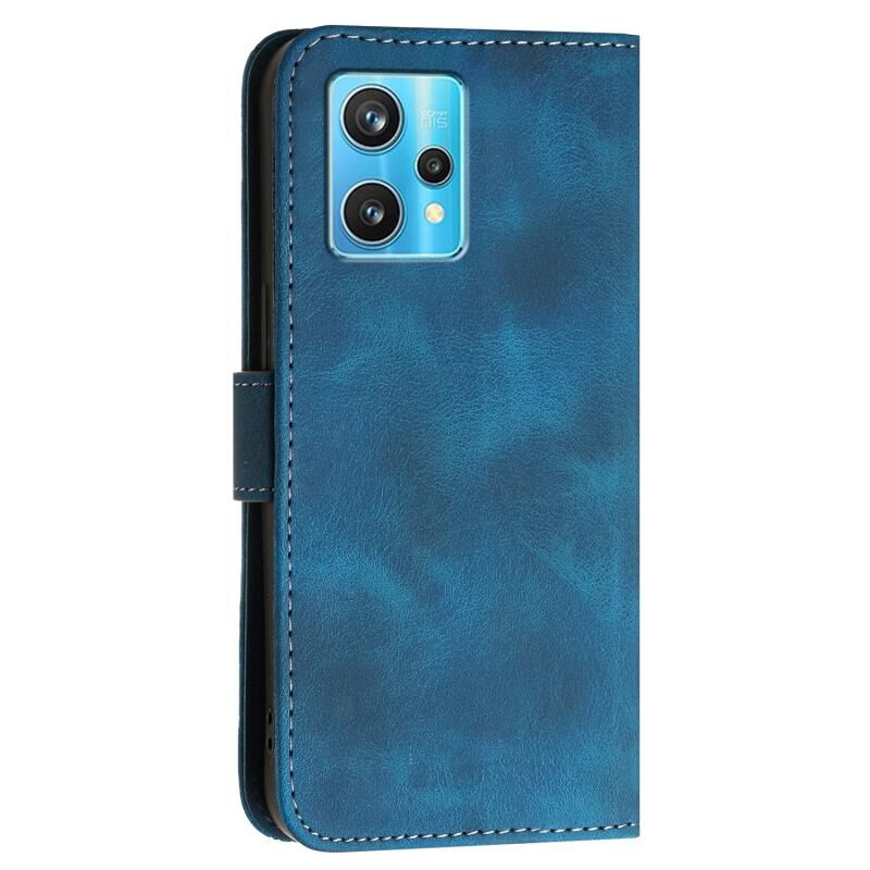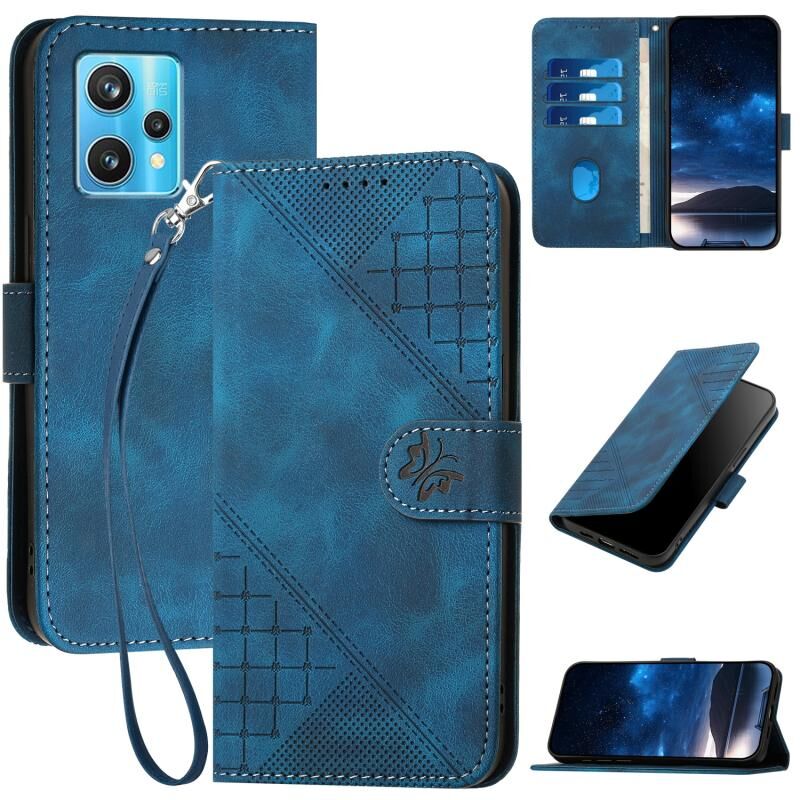 For Realme 9 Pro+ Grid Butterfly Embossed Pattern Leather Phone Case with Lanyard(Dark Blue)