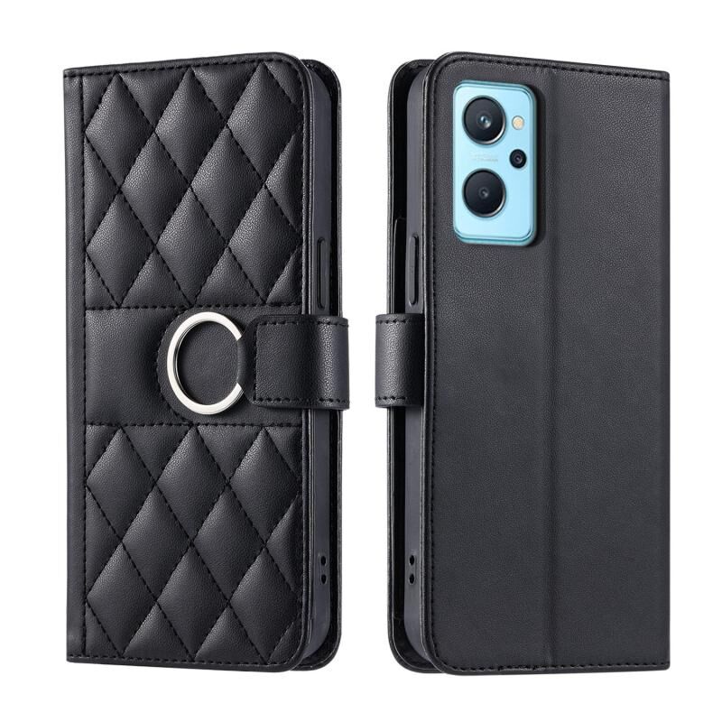 For Realme 9i Ring Buckle Rhombic Leather Phone Case(Black)