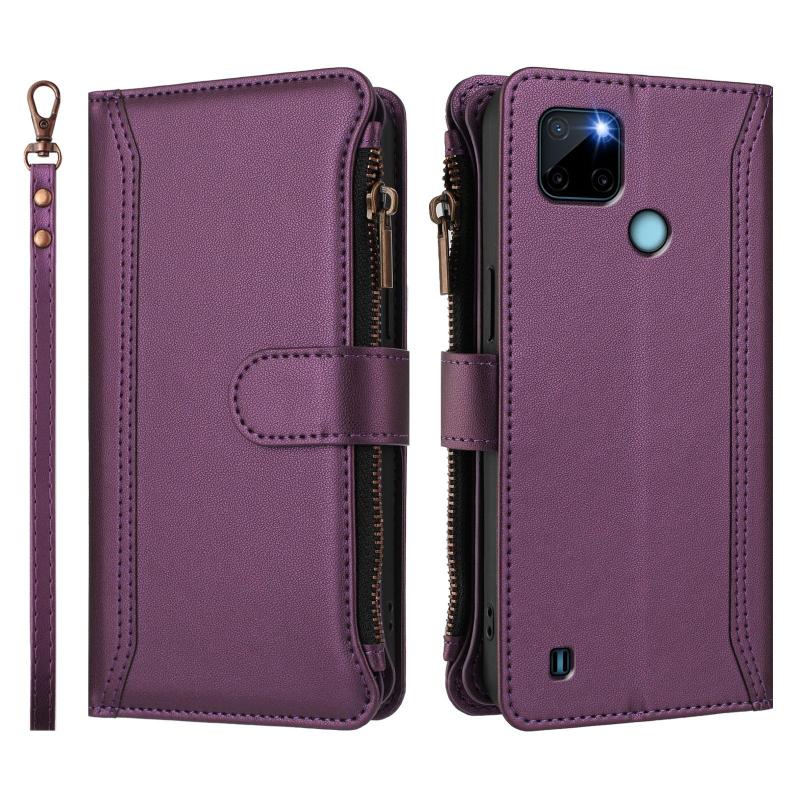 For Realme C21Y Magnetic Closure 9 Card Slots Zipper Leather Case with Hand Strap(Purple)