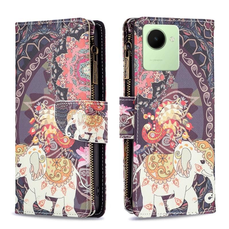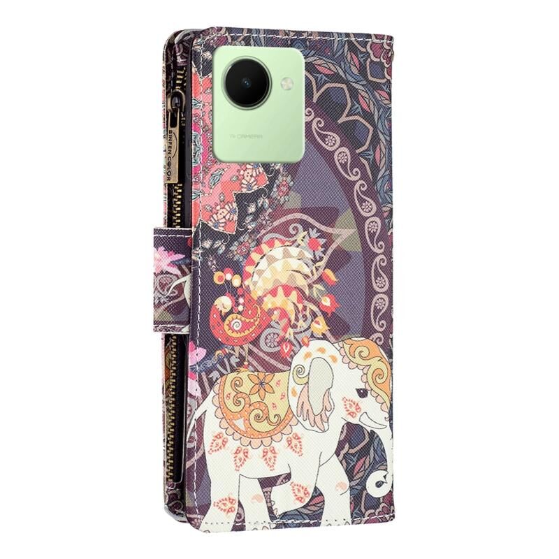 Θήκη τηλεφώνου από δέρμα με φερμουάρ και πολύχρωμο σχέδιο για Realme C30 (Λουλούδια και Ελέφαντες)